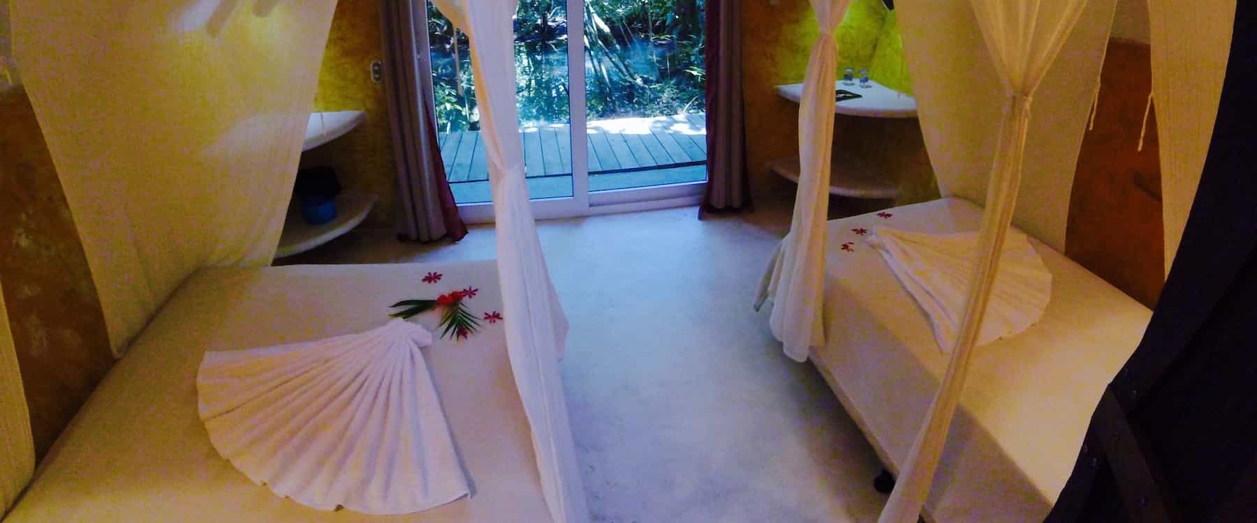 Hotel Hacienda Tijax Jungle Lodge & Marina, offers several options of accommodations for various budgets depending on the comfort level required. From spartan Cabins with a shared bath to our Cabañas Plus; our well finished, air conditioned, individual cabins offering máximum privacy, local construction details, private bathroom, orthopaedic mattress, and more. We also have family style villas with a small kitchen, private bathroom which we call “Bungalows”and can accomodate entire famililes or groups of anywhere from 2 to 8 passengers.