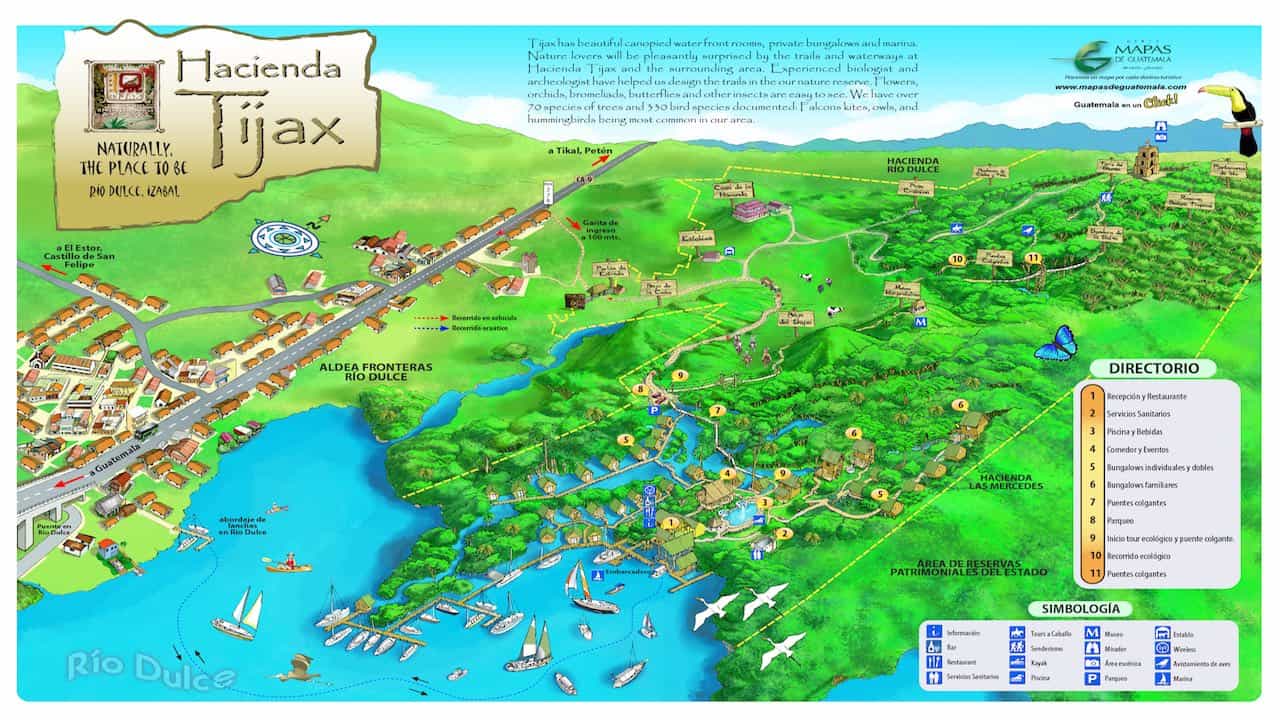 You should get to Rio Dulce at the town of Fronteras and ask for “Hacienda Tijax Lancha”. Please call 7930-5505 an we`ll send you boat transportation to get to Tijax.